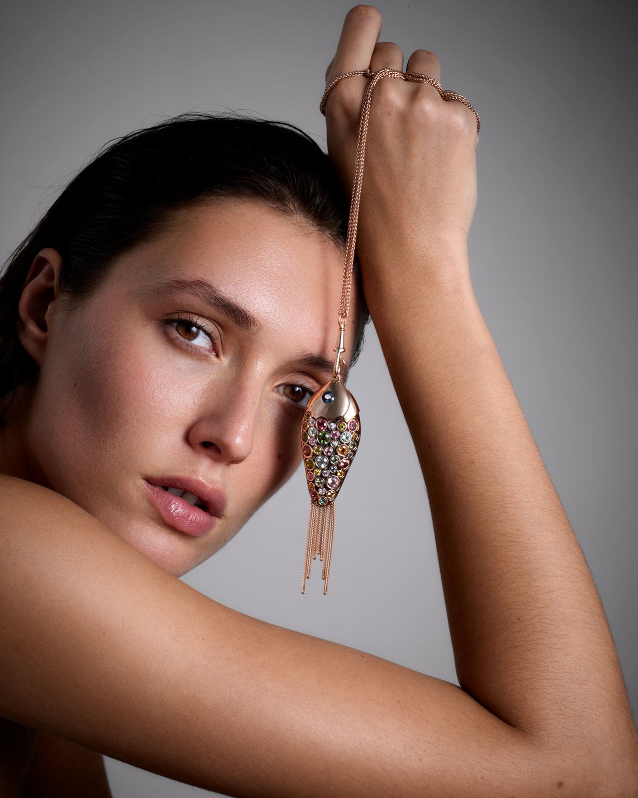Pendentif en or rose 18k, émail bleu ciel serti des tourmalines, saphirs, et des diamants