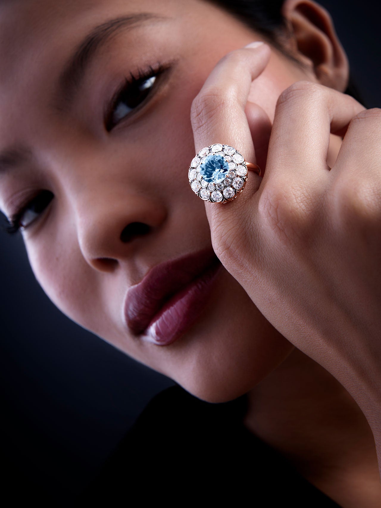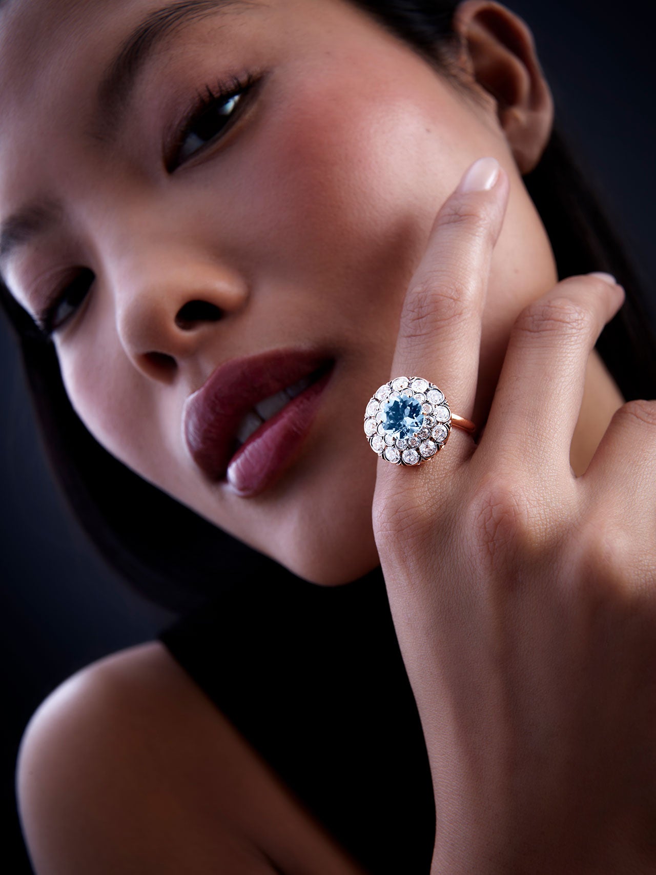 Ring in 18K pink gold set with aquamarine and diamonds