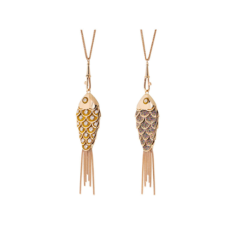 Pendant in 18K pink gold, yellow enamel set with colored sapphires, tsavorites and diamonds.