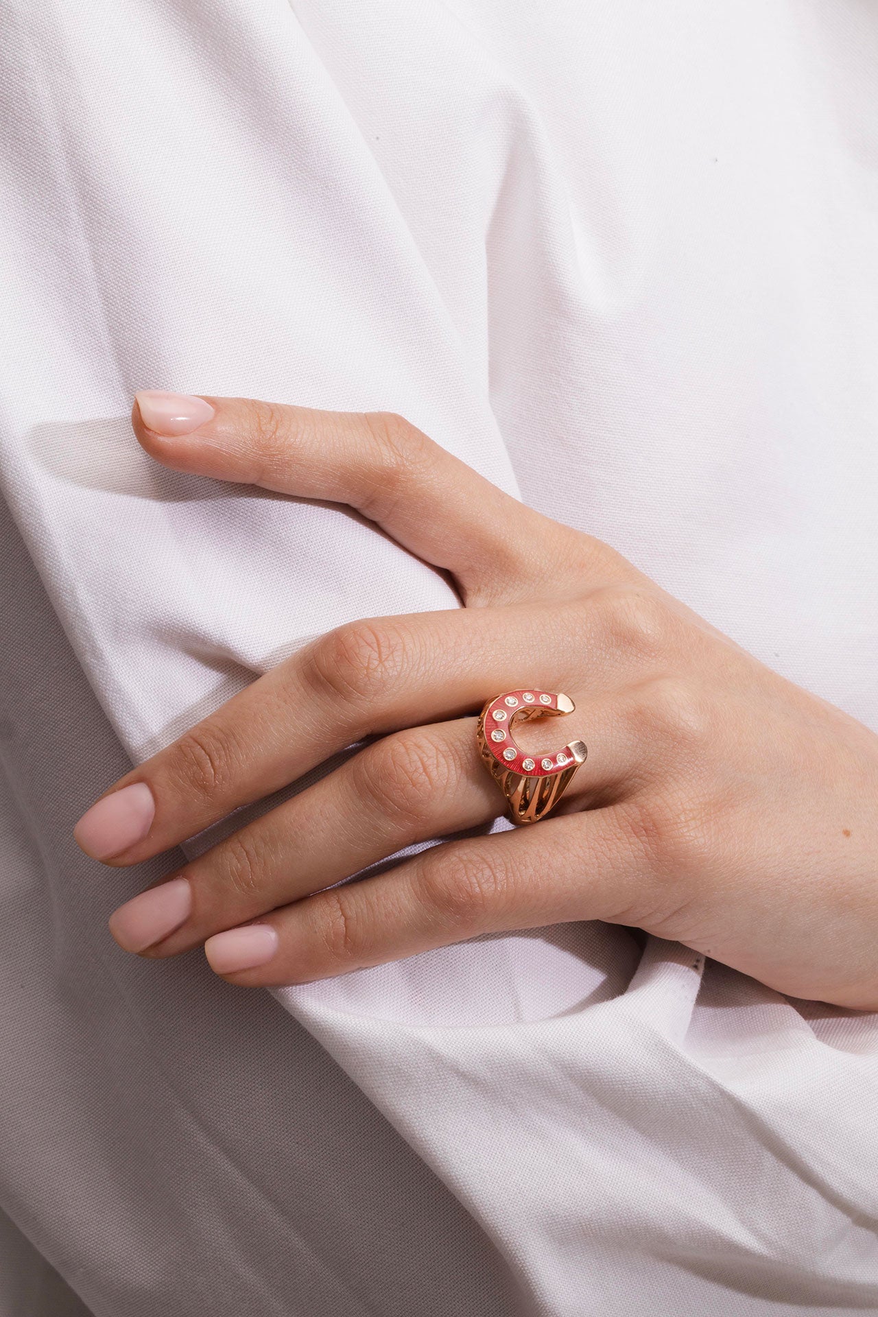 Ring in 18K pink gold and red snapper enamel set with diamonds