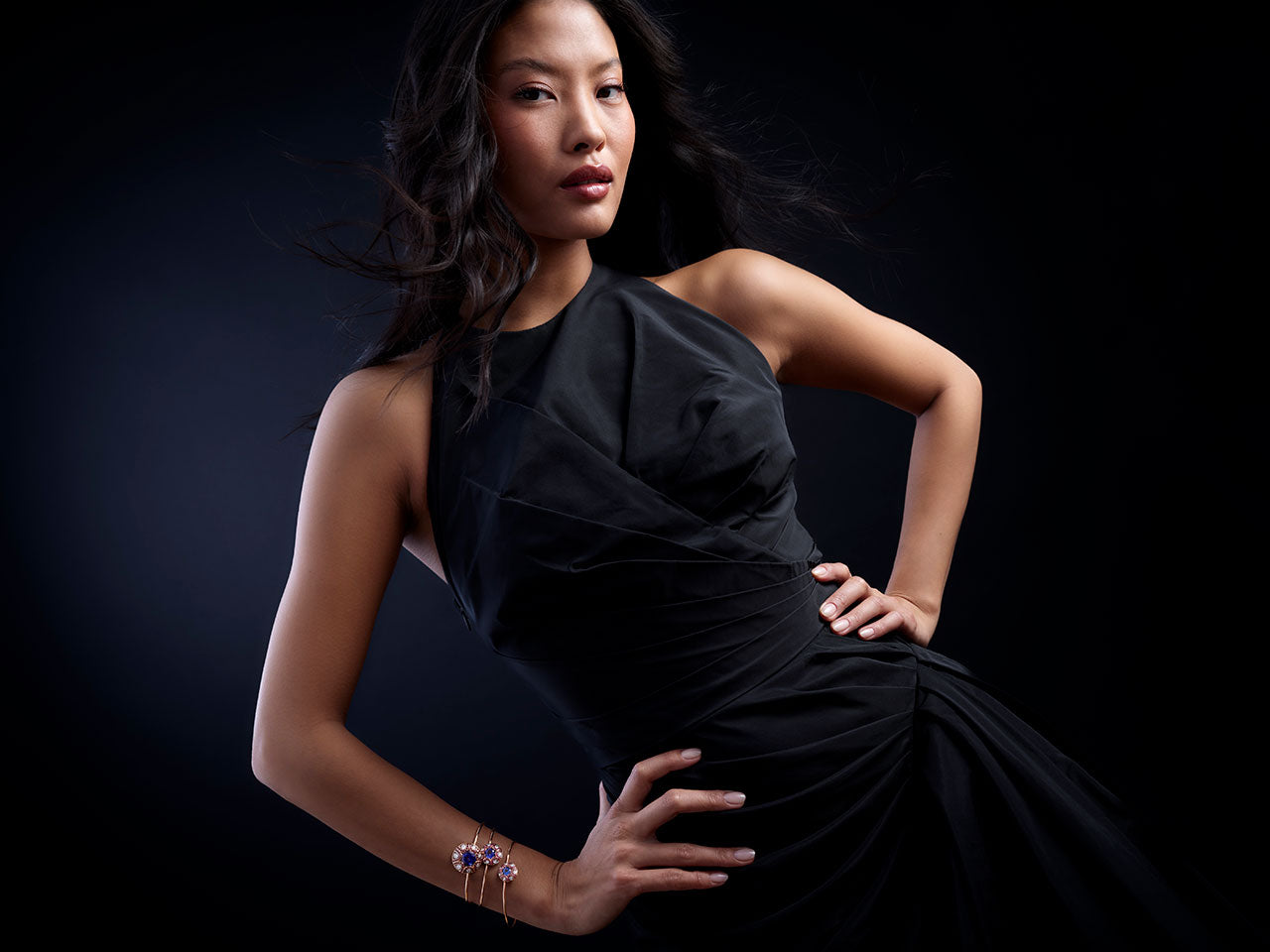 Bracelet in 18K pink gold set with tanzanite, rubies and diamonds