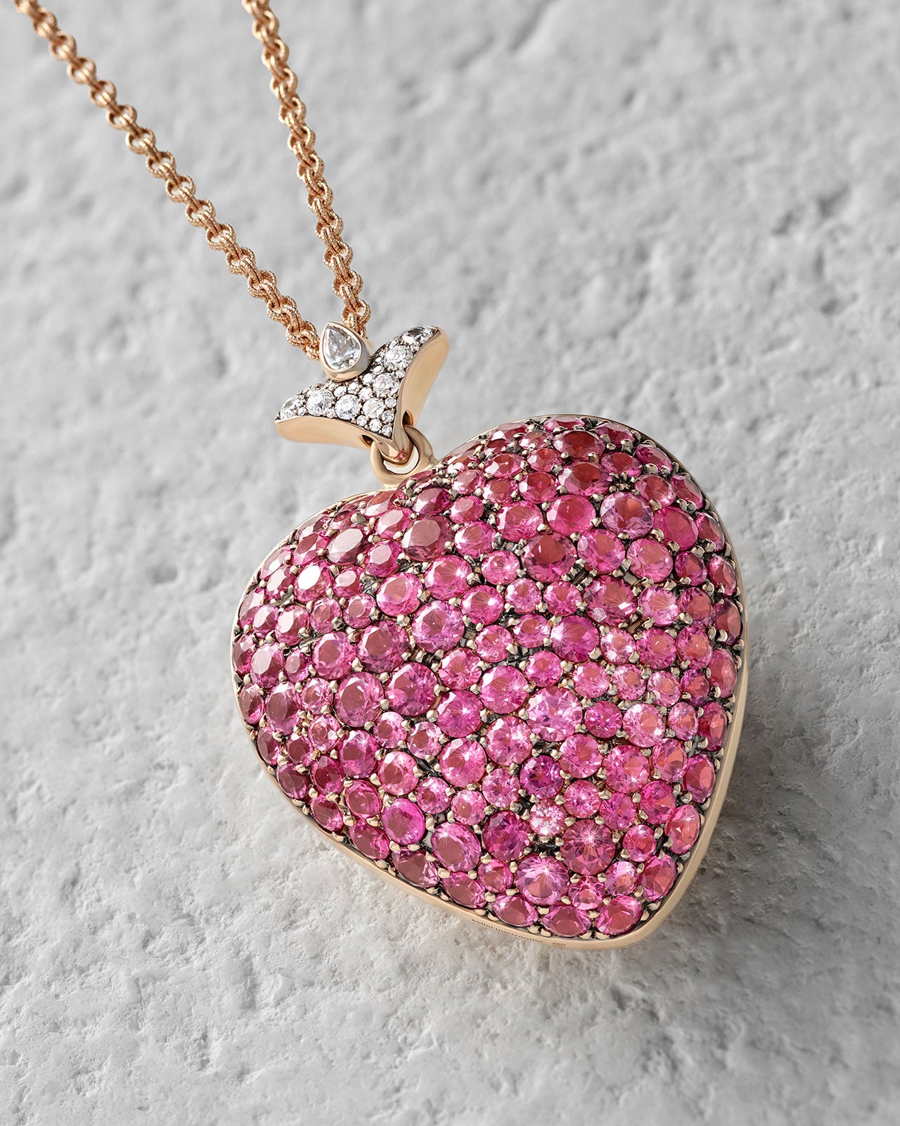 Pendant Heart in 18k pink gold & yellow enamel set with diamonds & tourmalines.